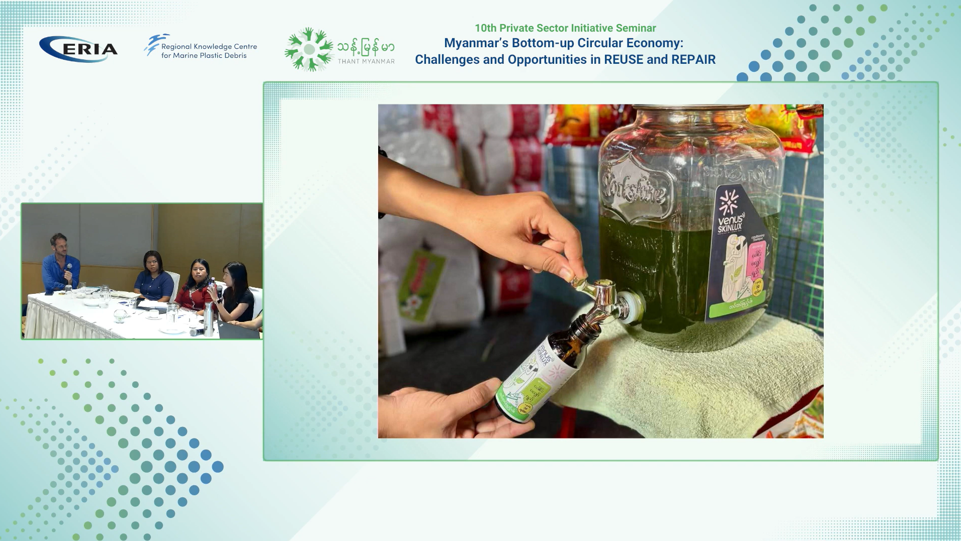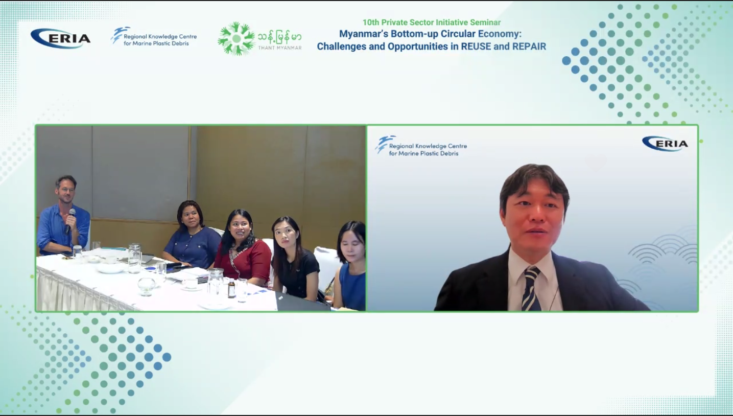 Against this backdrop, ERIA’s Regional Knowledge Centre for Marine Plastic Debris, in partnership with Thant Myanmar, convened a hybrid seminar titled Myanmar's Bottom-Up Circular Economy: Challenges and Opportunities in Reuse and Repair. The event brought together 117 participants, including experts, business leaders, and sustainability advocates from 24 countries to explore how Myanmar’s unique economic landscape fosters circular practices that reduce plastic waste and prevent marine debris.