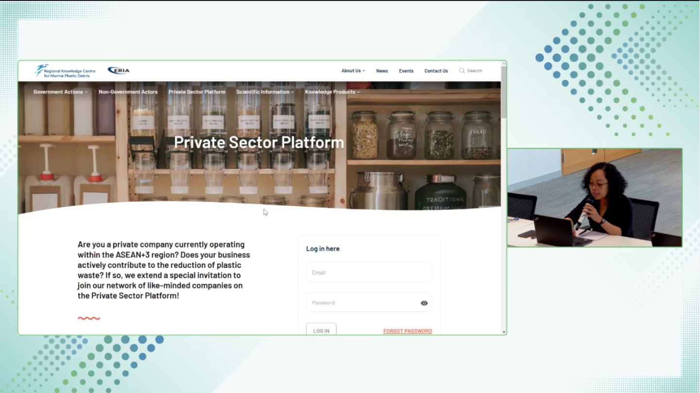 Highlighting the crucial role of the private sector in driving scalable solutions for reuse and repair, participants were invited to join the Regional Knowledge Centre’s Private Sector Platform (PSP), an online hub showcasing innovative solutions for plastic waste reduction. Ms Elsa Noviani, Knowledge Management Associate at ERIA, encouraged private sector actors to register on the platform for an opportunity to showcase their products, services, and technologies that are contributing to plastic waste reduction. their products, services, and technologies that are contributing to plastic waste reduction.