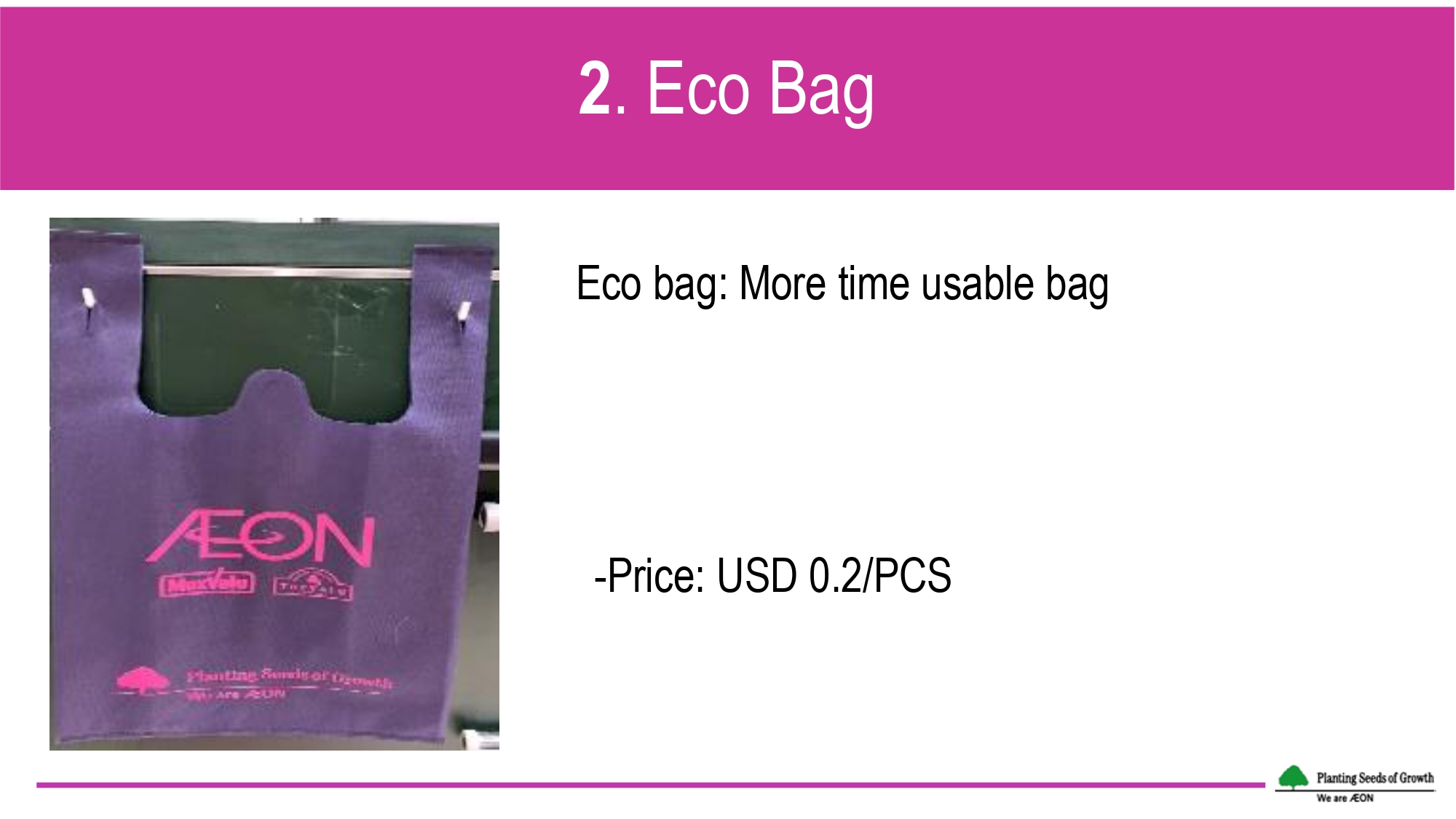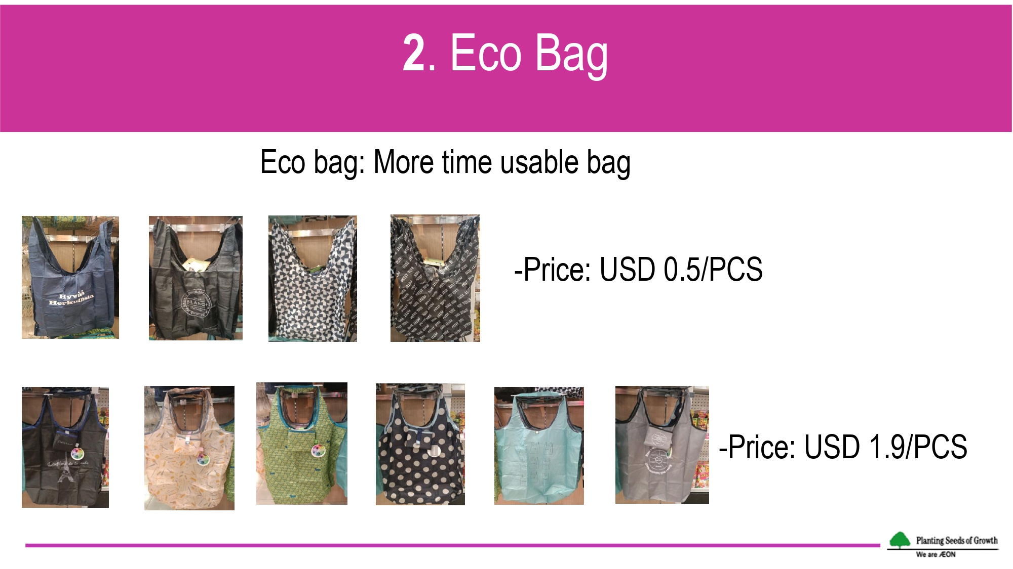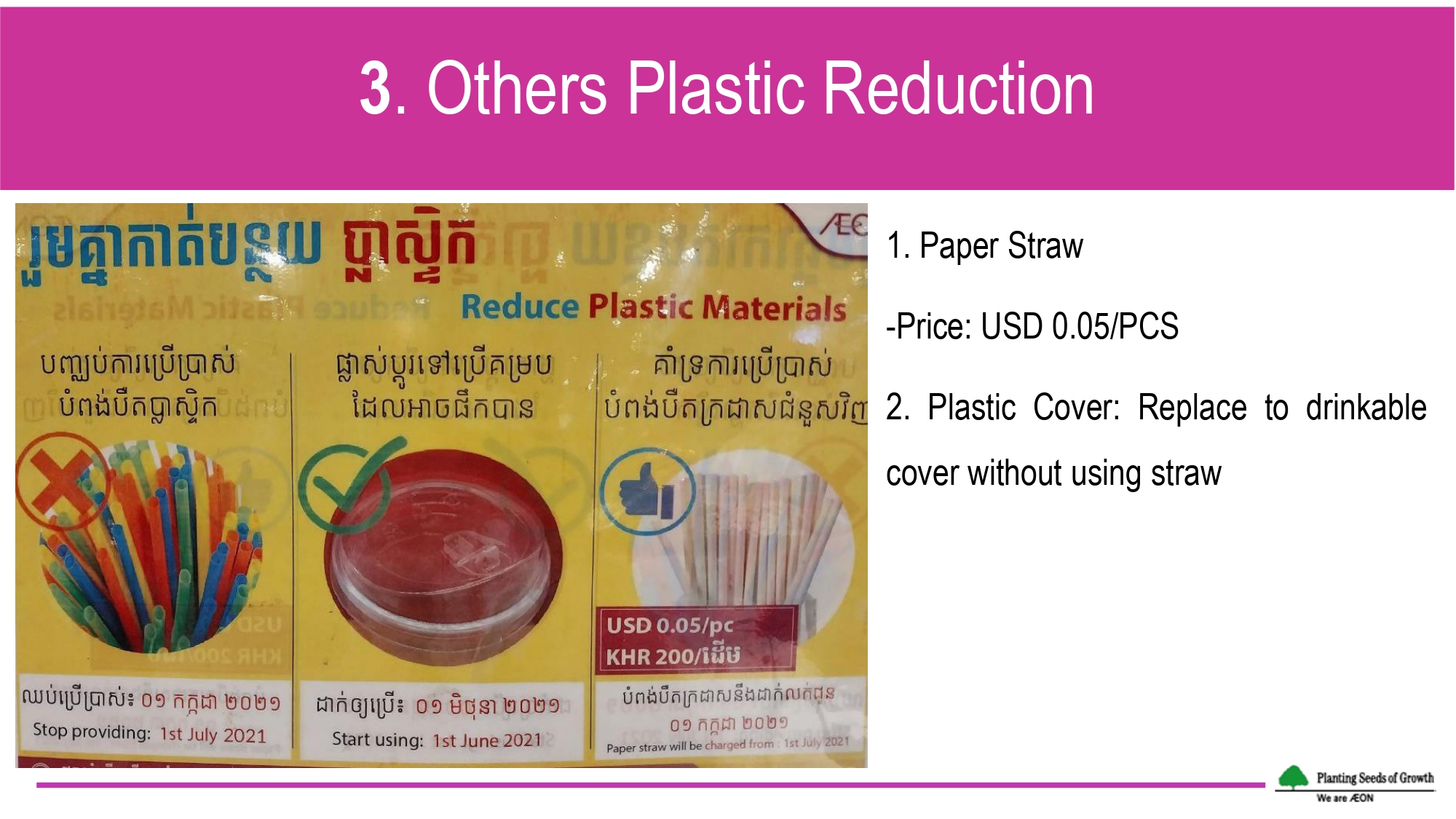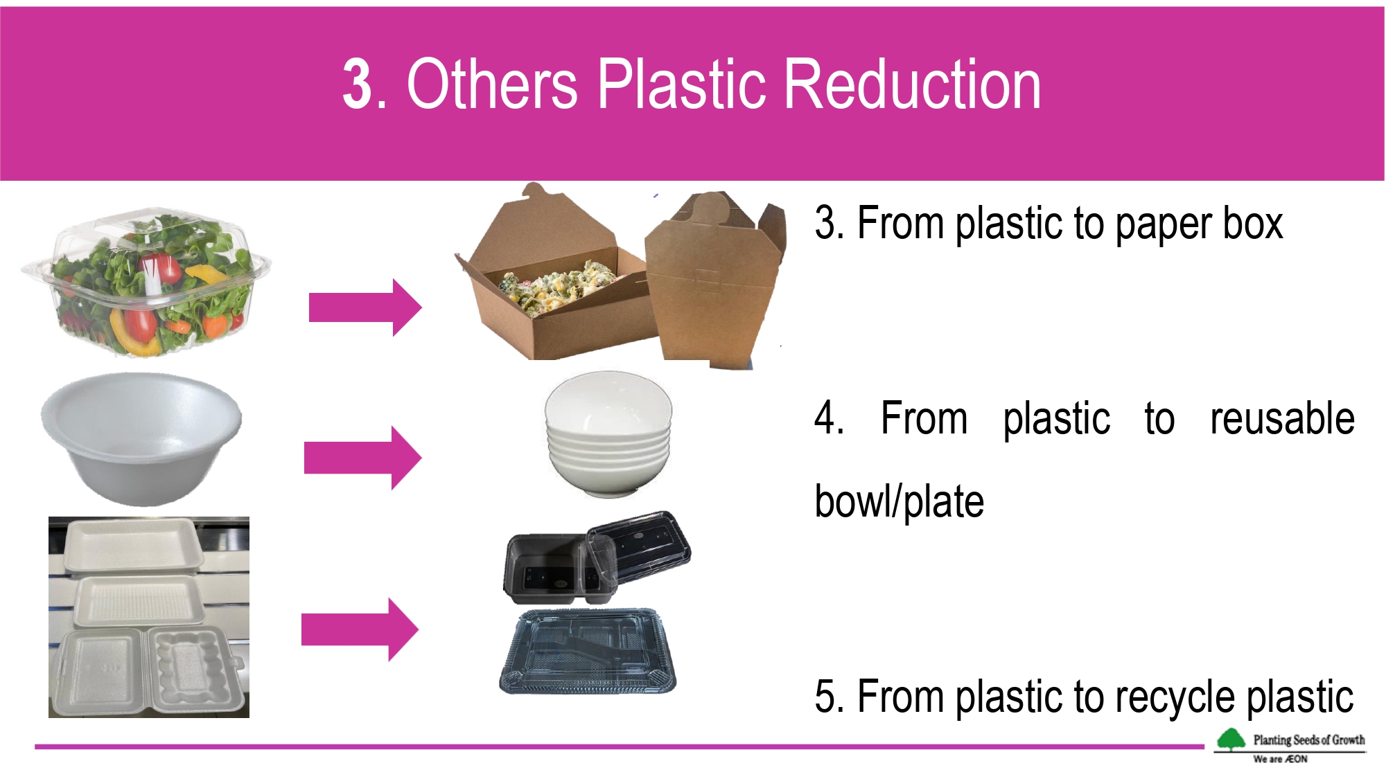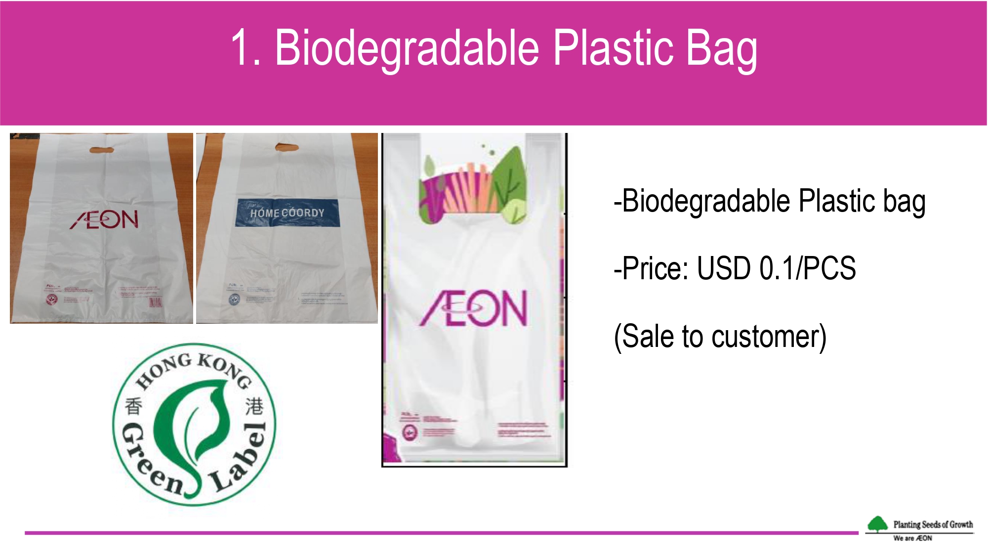Since January 2021, biodegradable plastic bags have been offered to the consumers with a selling price of USD 0.10 per bag. The bags have been previously assessed to guarantee its biodegradability and further eco-labelled with the Hong Kong Green Label. Reusable eco bags with different varieties and prices are also offered to replace single-use plastic bags. Since July 2021, paper straws have introduced to replace the plastic straws for beverages, while some foods like salad, are currently packaged with paper box, instead of plastic box. In food court station, styrofoam bowls/plates have been mainly replaced with regular bowls/plates for dine-in purpose.